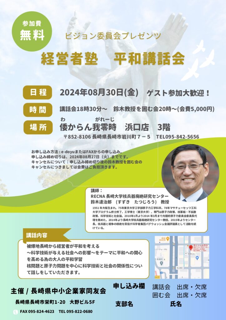 この度、県ビジョン委員会で経営者塾の一環として「平和講話会」を企画しました。